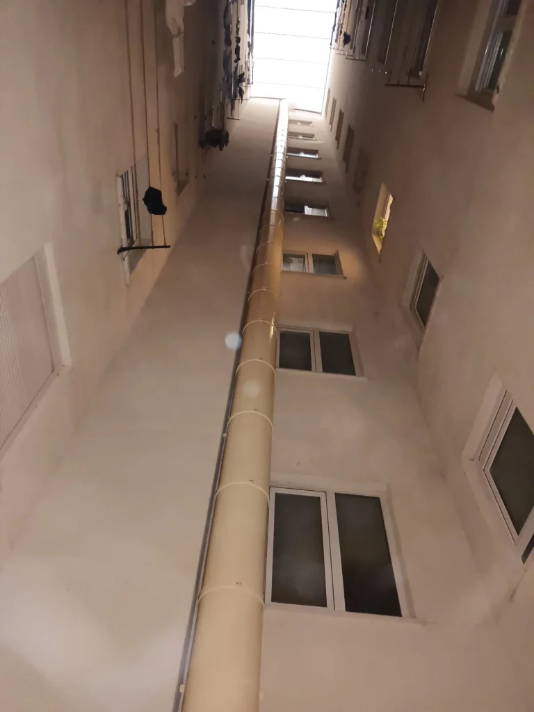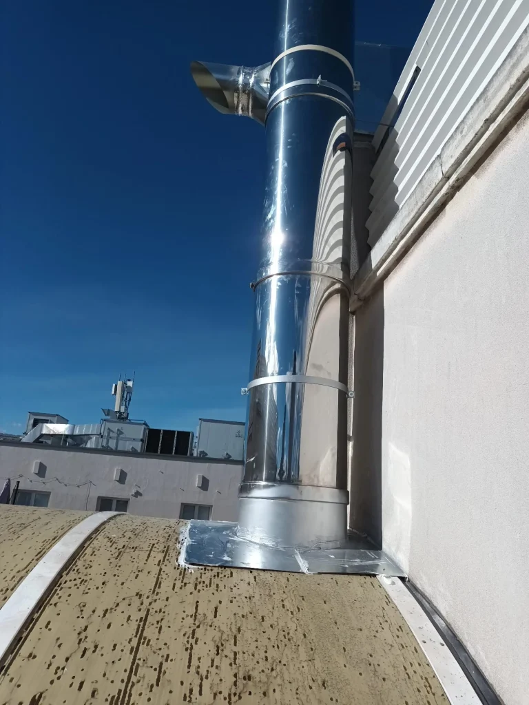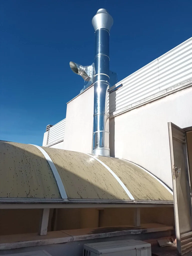 En el 100 Montaditos de Las Cortes (Madrid) diseñamos una chimenea de 36 metros que combina funcionalidad y estética. La instalación incluye acabados personalizados con pintura beige e INOX pintado para integrarse perfectamente en el entorno.