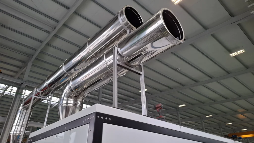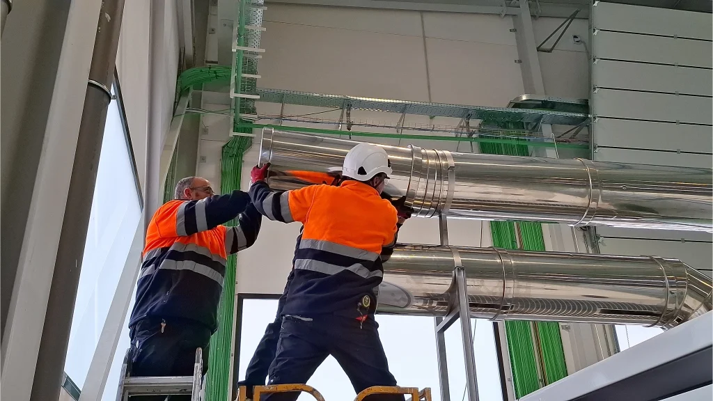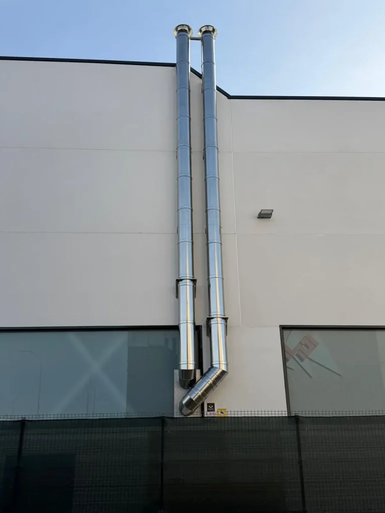 En una fábrica de vidrios en Móstoles, instalamos una chimenea KE de 10 metros para la evacuación de humos de un grupo electrógeno. Una solución compacta, resistente y adaptada a las exigencias del entorno industrial.